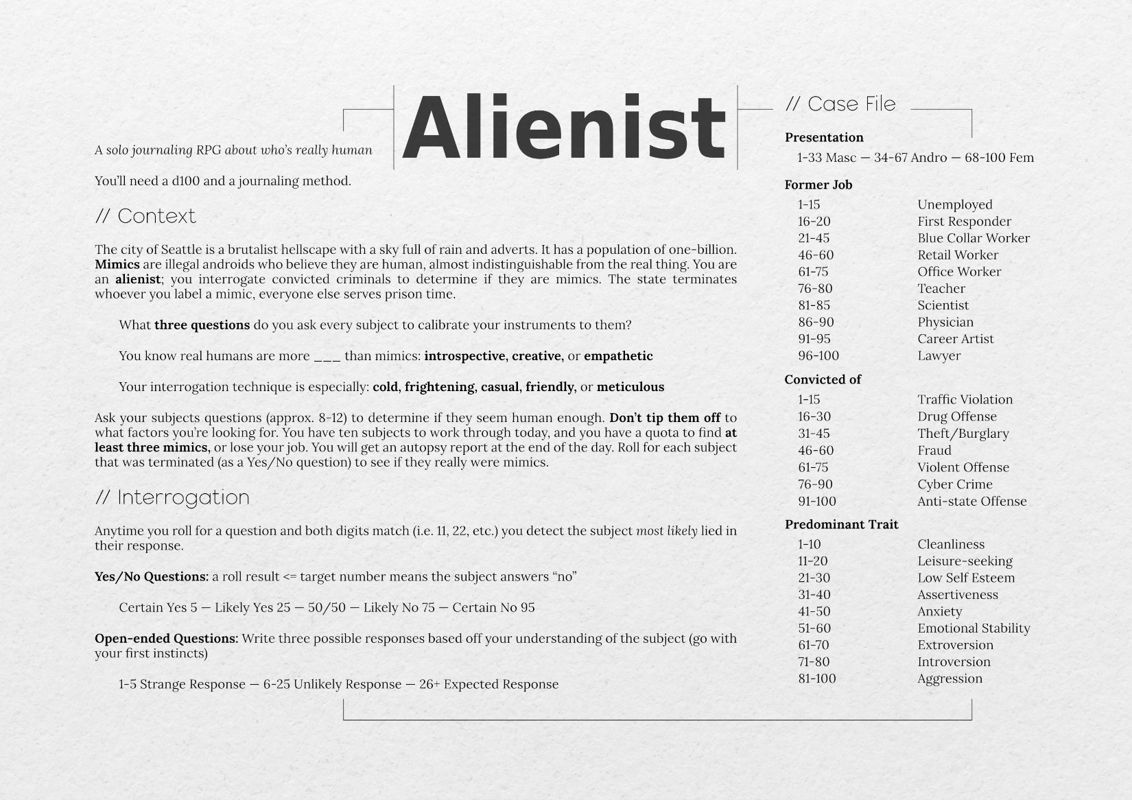 This is a submission for the One Page Weekender 2026 Jam with the theme "Not Human." You play as an Alienist, someone who tries to determine if convicted criminals are humans or a special kind of android called Mimics. The game is human-made, AI-free.